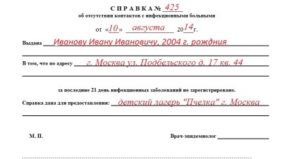 Справка о благоприятном эпидокружении свидетельствует об отсутствии контактов с инфекционными больными за последние 21 день (дополнительные названия этой же справки: справка эпидокружение, справка об эпид благополучии, эпид справка).